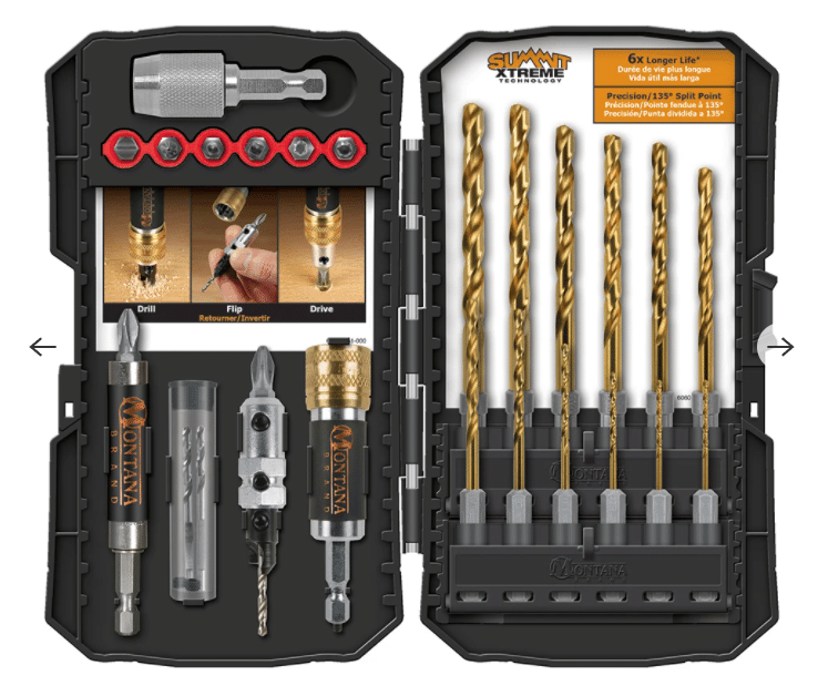 When developing this set, we considered all the various jobs regularly performed on our Montana homes and ranches. The foundation of this set is our Fast Change Connector for quick, easy, and secure tools changes without needing to re-chuck your drill/driver. Get your jobs done with professional results. The modular 4-in-1 Drill & Driver provides versatility and ease-of-use for contractor and DIY projects. Drill, countersink, or counterbore, then release the locking collar, flip the modular insert and drive screws. Precision made for drilling accuracy and high-torque driving applications. A great woodworking tool and companion set with the Montana Brand Self-Centering Plug Cutters. Made in the USA by Montana Brands.