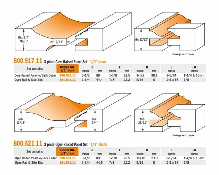 If your project calls for top quality raised panel doors, milled with accuracy and efficiency, then this set is a great choice. The ogee rail and stile bits are made to exact specifications to match perfectly, and the stile cutter is designed with a shear angle to produce superior cuts with minimal splintering. The raised panel bit is available with either cove or ogee profiles. Both bits include a back cutter which allows milling of the front and back of the panel in a single pass. Packaged in a sturdy recloseable plastic case.