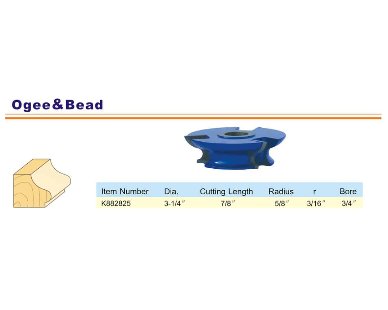 The Blue Tornado ogee and bead shaper cutter will make drawer edges, table edges, or other types of molding. These ogee and bead edge shaper bits feature top-quality C3 carbide. Extra thick carbide tips insure many re-sharpening opportunities and longer tool life. Legend below explains sizing. Select your item(s) then click Add to Cart.