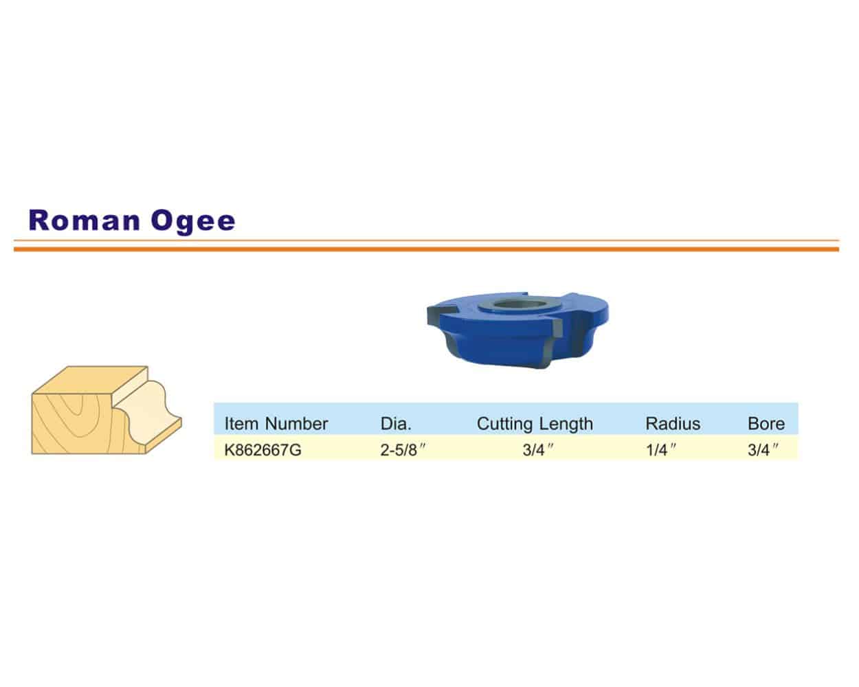 The Blue Tornado roman ogee shaper cutter will produce great looking edges on raised panel doors and other decorative molding applications. This ogee edge shaper bit features top-quality C3 carbide. Extra thick carbide tips insure many re-sharpening opportunities and longer tool life. Legend below explains sizing. Select your item(s) then click Add to Cart.