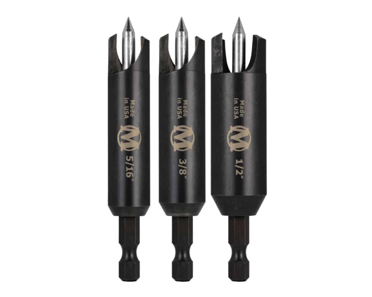 Cutting wood plugs has never been easier with Montana Brand’s self-centering plug cutters. Which allow you to cut accurate tapered plugs with a hand drill. These plug cutters feature a unique. Patented, self-centering design, a retractable pin guide, 4-point cutting blades, precision CNC machined high-alloy steel with a black oxide finish, heavy duty single-piece construction, and a 1/4 inch quick change compatible shaft. These plug cutters are fast and accurate and are great for cutting plugs at the job site. MB65907 thru MB65919 are single plug cutters and MB65823 is a 3-piece set.